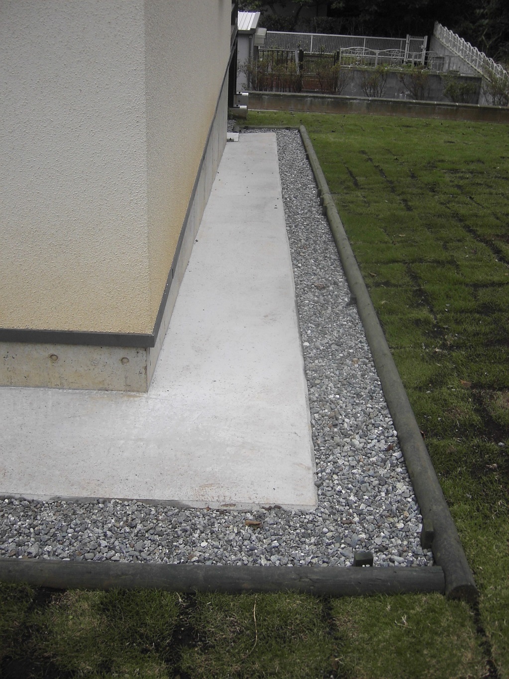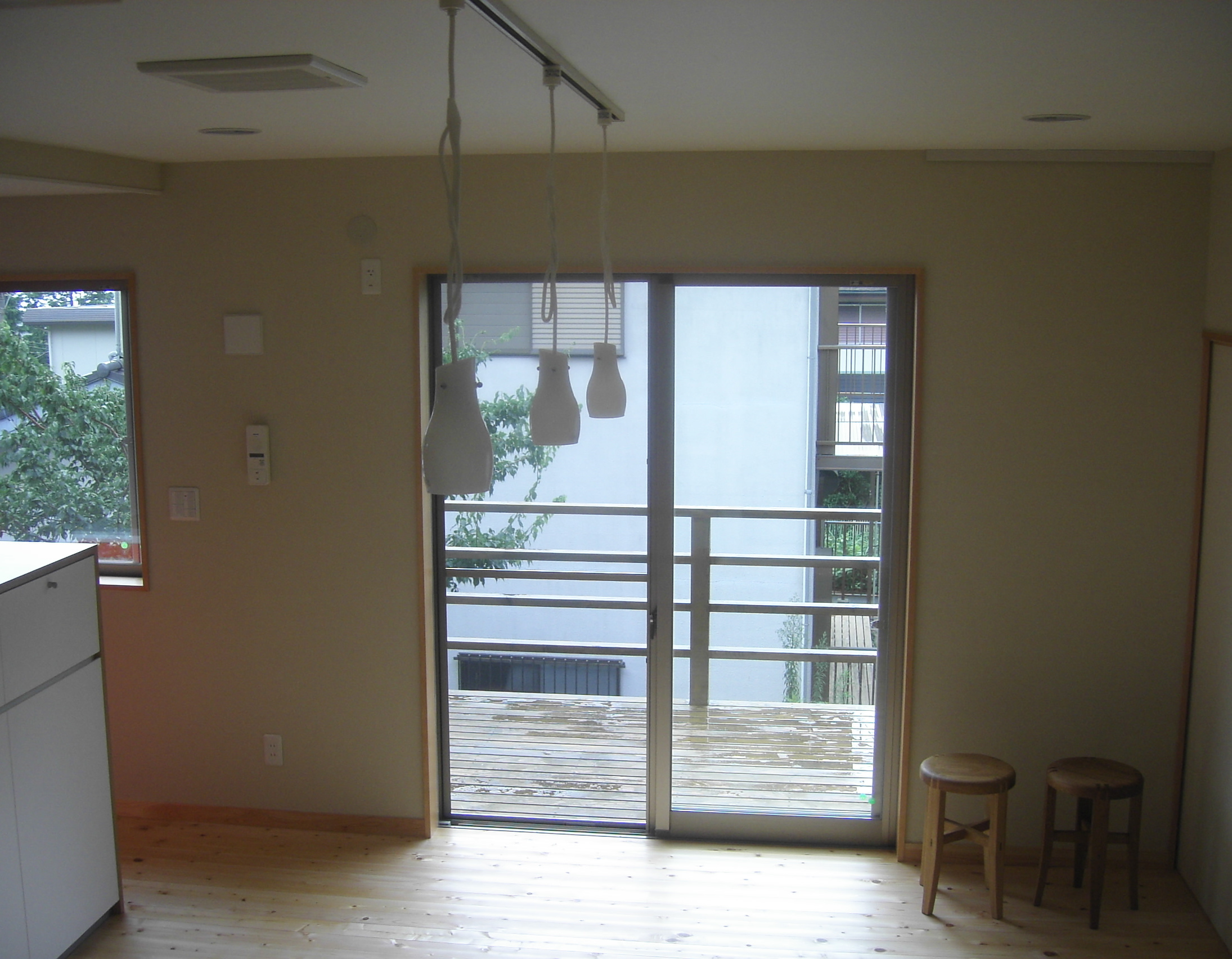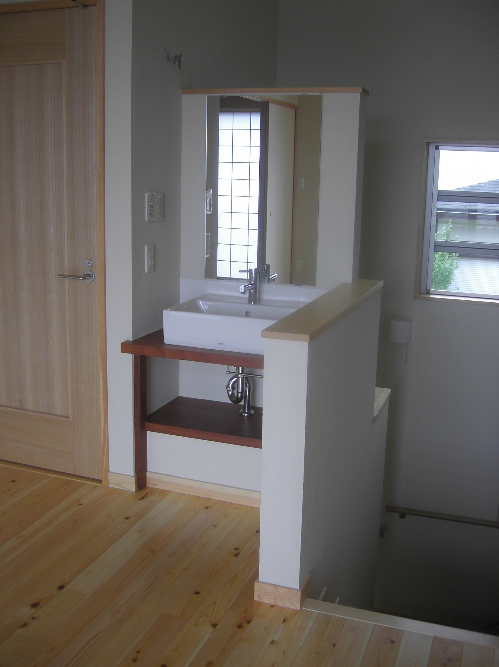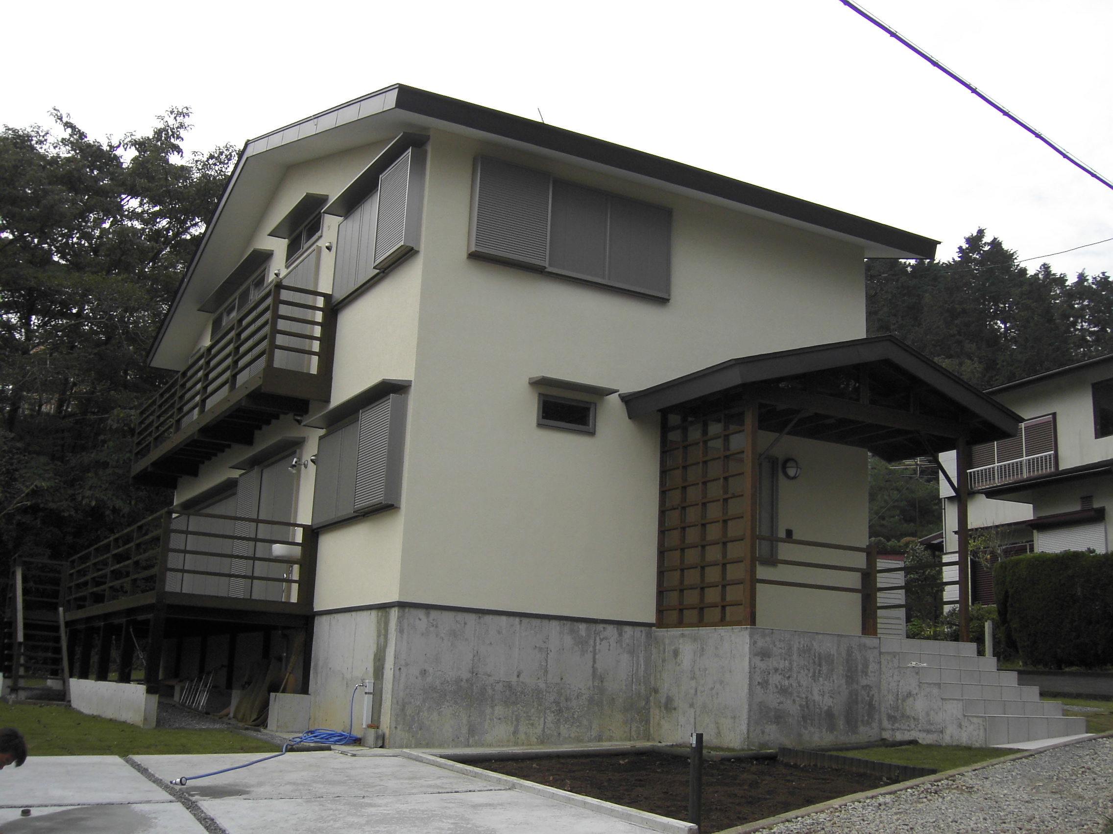 敷地に高低差があり、奥と手前で2.5mの差があった。低いほうにあわせて整地する方法もあったが、あえて自然のままの地形で点てることにした。そのため玄関前に五段ほどの階段を上がったポーチを造った。あえてフェンスを造らないということだったので、これが柔らかな境界となった。